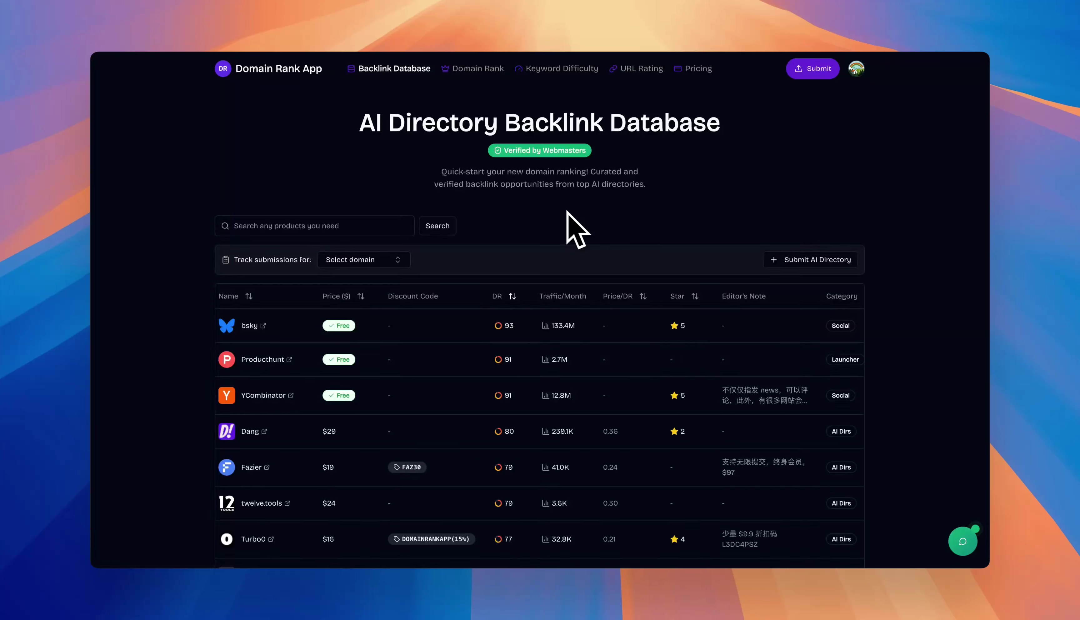 Quick-start your new domain ranking! Curated and verified backlink opportunities from top AI directories.