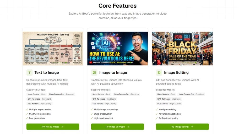 AI Best is a comprehensive AI-powered platform for creative content generation, offering a suite of tools for image and video creation. The platform supports over 9 advanced AI models including Nano Banana, GPT-4o Image, Flux Kontext, Veo 3.1, Sora 2, Kling 2.6, and Wan 2.5.