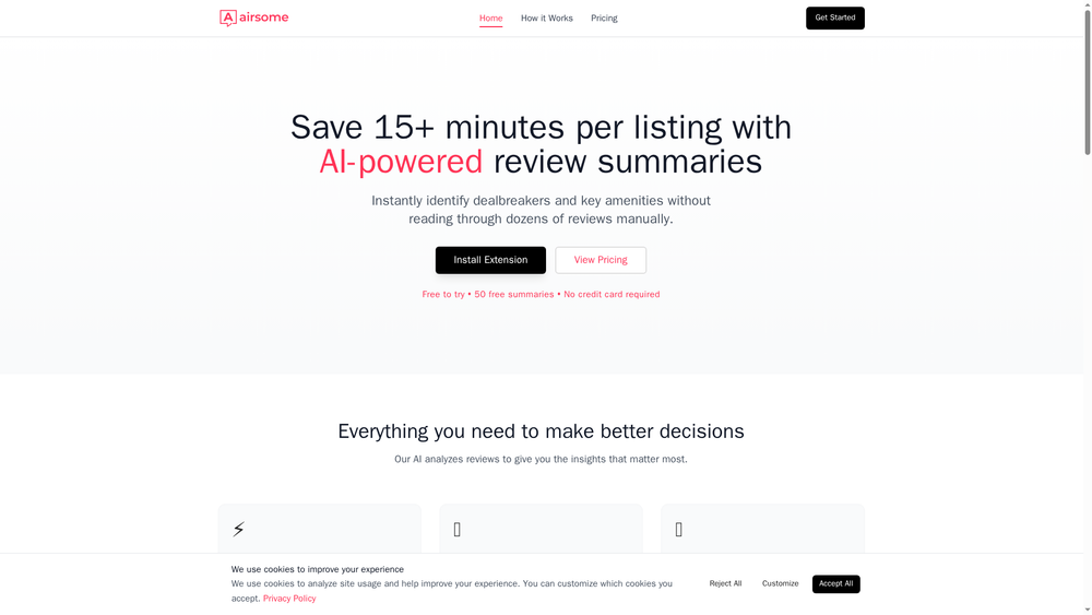 AirSome is an AI-powered Chrome extension designed to revolutionize how travelers evaluate Airbnb listings. By leveraging Google's Gemini 2.0 Flash AI model, it analyzes dozens of reviews in seconds to provide comprehensive summaries, saving users 15+ minutes per listing.