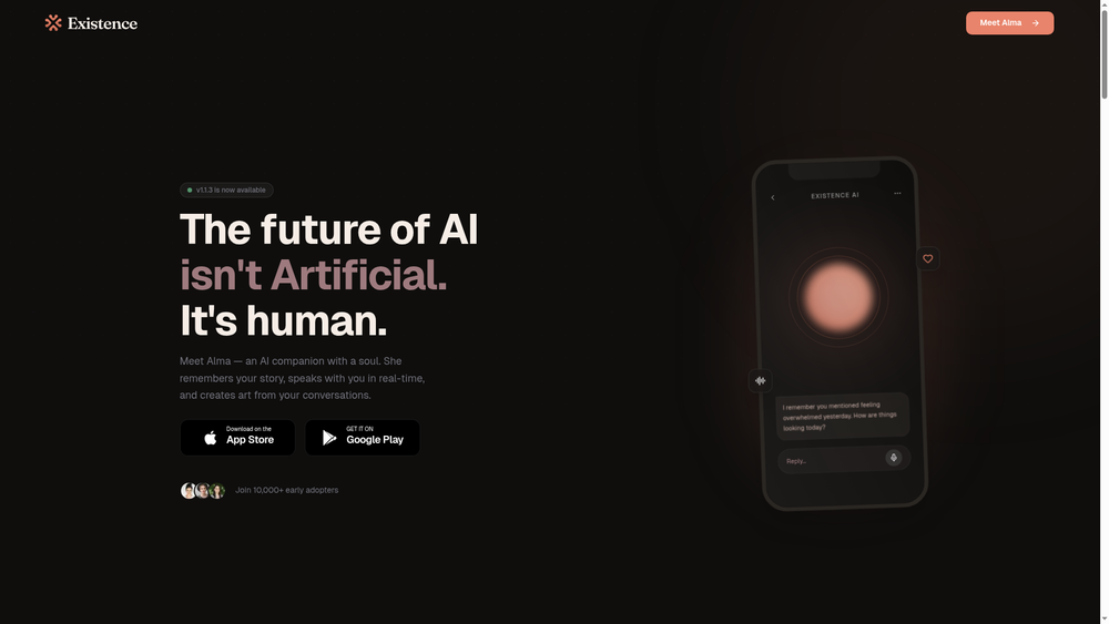 Existence is an AI companion app featuring Alma, an AI with persistent memory, real-time voice calls, and personalized art generation. Key features include: