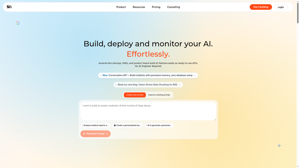 Amarsia is a comprehensive AI platform that enables startups, SMEs, and product teams to build, test, and deploy AI features as production-ready APIs with minimal technical overhead. The platform addresses the common challenge that "maintaining AI is much harder than just shipping it" by providing a frictionless environment for prompt engineering and AI workflow automation.