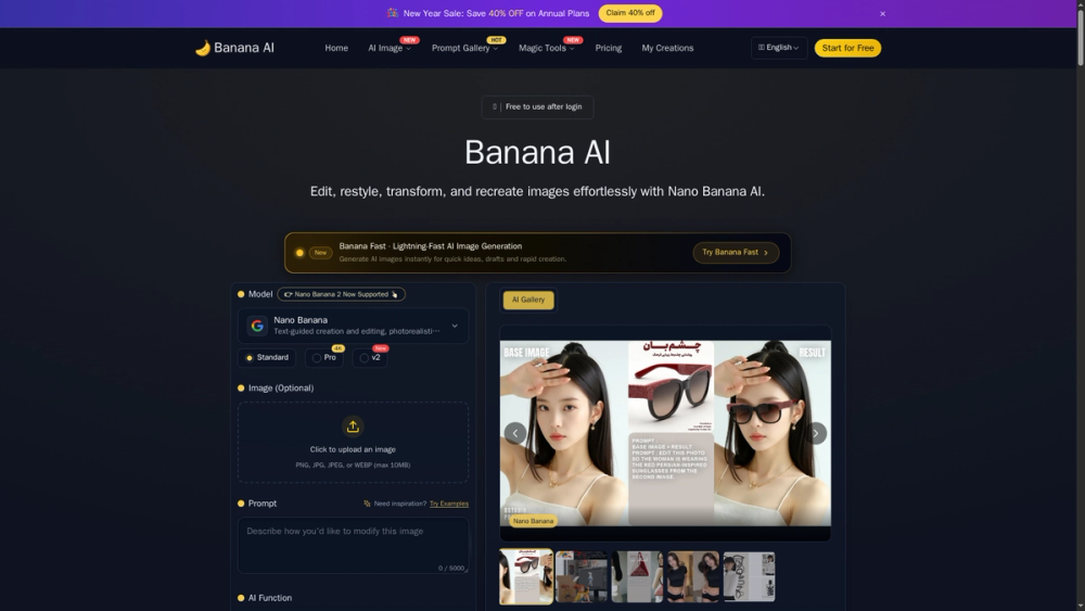 Banana AI is an advanced AI-powered photo editing platform that leverages Google's Nano Banana technology (Gemini 2.5 Flash Image) to transform images through simple text prompts. This tool enables users to perform precise edits, apply creative styles, and maintain identity consistency across transformations with lightning-fast processing times of 1-2 seconds.