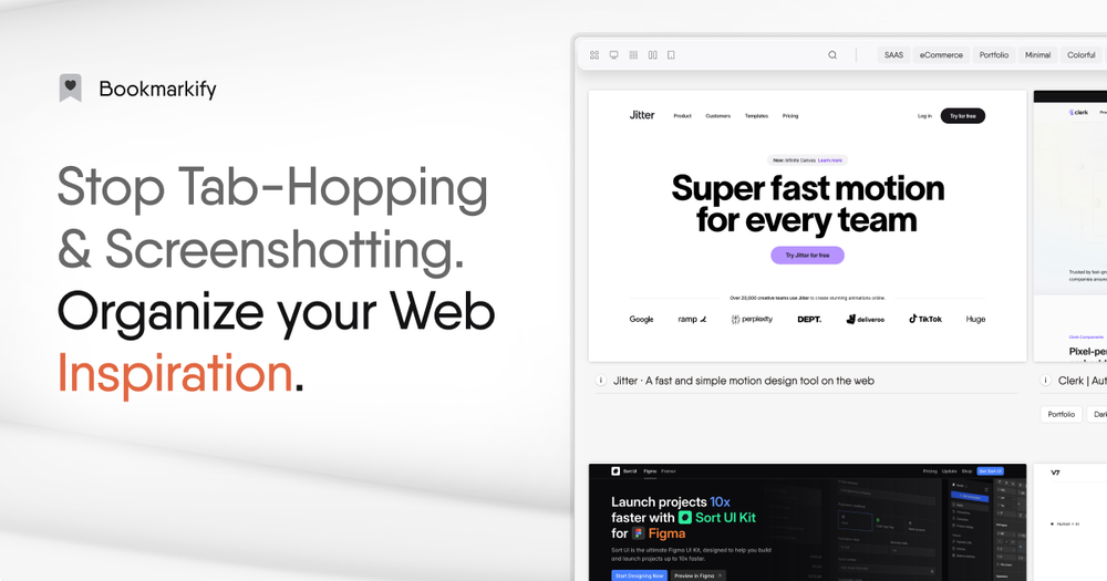 Bookmarkify is a comprehensive visual bookmark manager designed specifically for creative professionals who need to organize web design inspiration. Unlike traditional text-based bookmark managers, Bookmarkify captures full-page screenshots of websites and provides multiple viewing modes including grid, fullscreen, triple, long, and mobile previews.