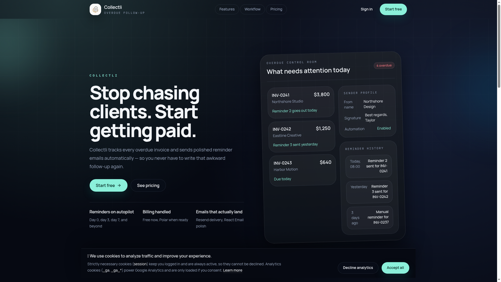 Collectli is a specialized SaaS tool designed specifically for freelancers and small agencies who struggle with chasing overdue payments. The platform automates the entire invoice follow-up process, eliminating the awkwardness of manual reminders while ensuring timely payments.