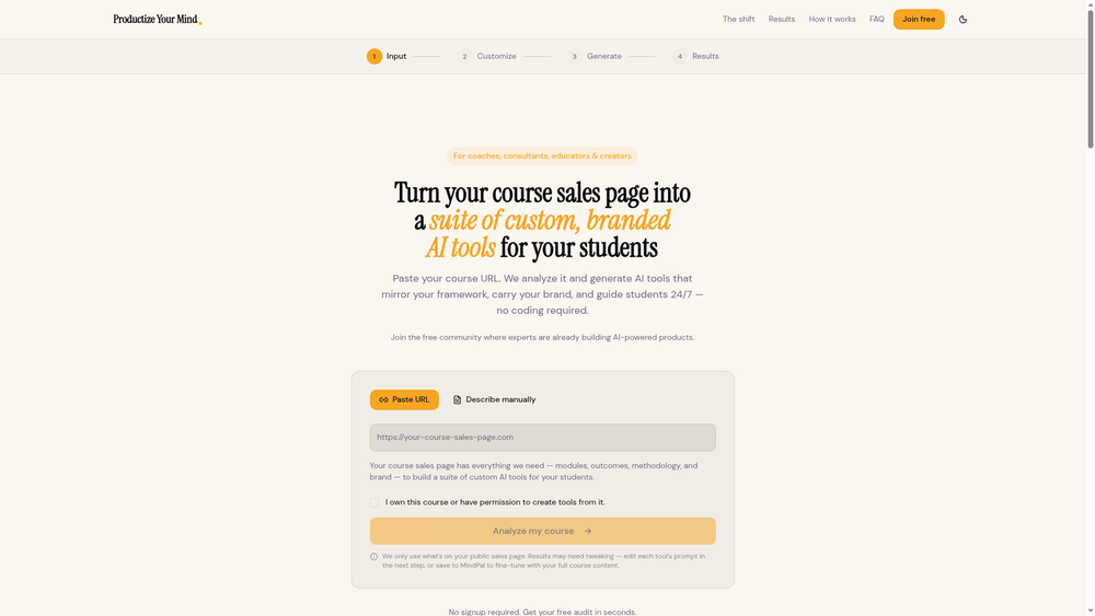 Productize Your Mind is a platform that transforms static course sales pages into interactive, branded AI tool suites for students. By analyzing course URLs, it extracts modules, outcomes, methodology, and brand elements to generate custom AI tools that mirror the instructor's framework and voice.