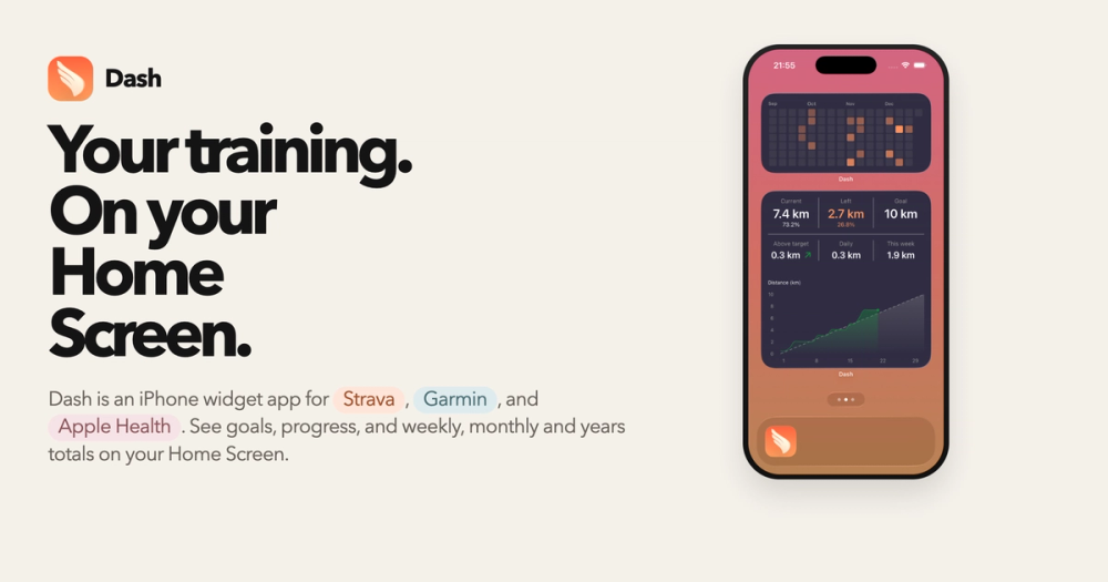 Dash is a specialized iPhone application that provides Home Screen widgets for fitness tracking platforms. It integrates with Strava, Garmin, and Apple Health to surface key workout metrics directly on users' iPhone Home Screens without needing to open multiple apps.