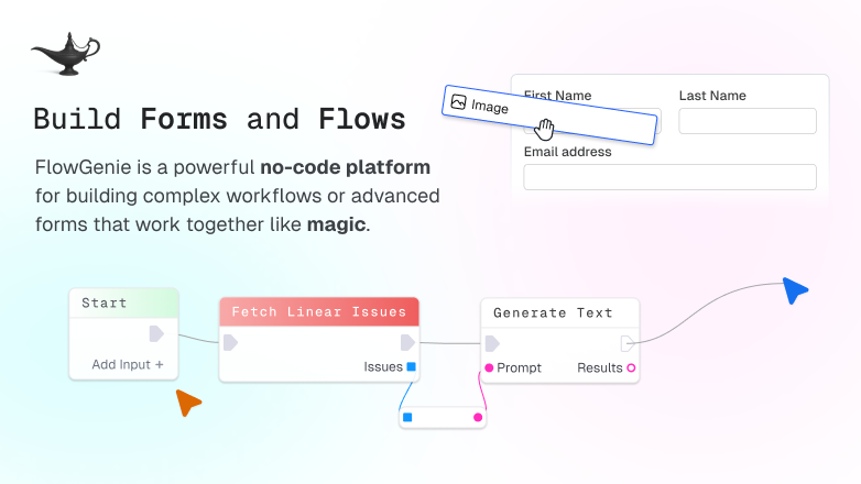 FlowGenie is a visual development platform that enables users to create logic-driven applications without writing code. It combines a blueprint-style editor for building workflows with a form builder, allowing for the creation of complex automations and interactive forms.