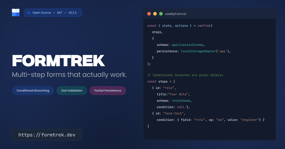 FormTrek is a specialized React library designed to simplify the creation of complex multi-step forms in modern web applications. It provides developers with a single, powerful hook that handles the challenging aspects of multi-step form logic while allowing complete control over the user interface.