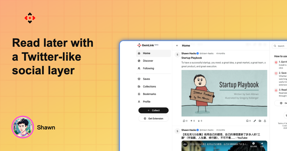 GemLink is a modern web collecting platform that bridges the gap between personal bookmarking and social discovery. At its core, it functions as an enhanced 'read later' service similar to Pocket, but adds a Twitter-like social layer where users can share their collections and interact with others.