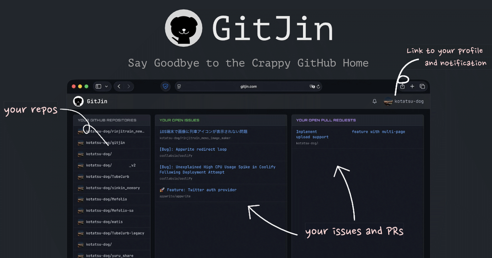 GitJin is a developer-focused dashboard that enhances the GitHub experience by providing a unified interface for managing repositories, issues, and pull requests. It addresses the limitations of GitHub's default homepage by offering a more organized and efficient workflow.