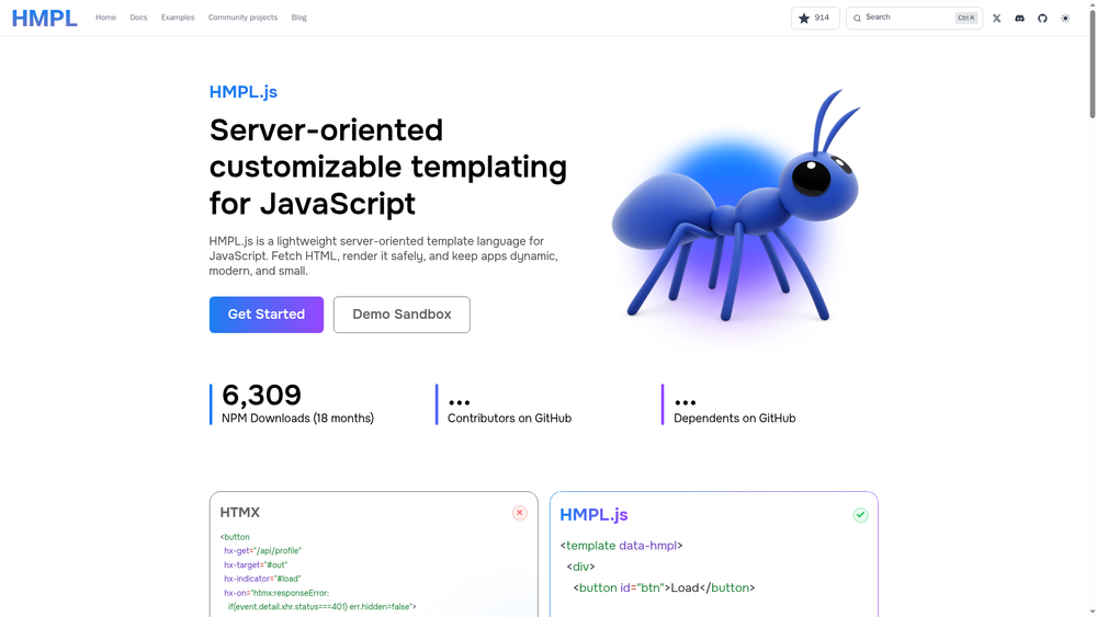 HMPL.js is a modern template language designed for JavaScript applications that prioritizes server-side rendering and dynamic content delivery. It provides a lightweight alternative to frameworks like HTMX and Alpine.js, focusing on efficient HTML fetching and safe rendering.