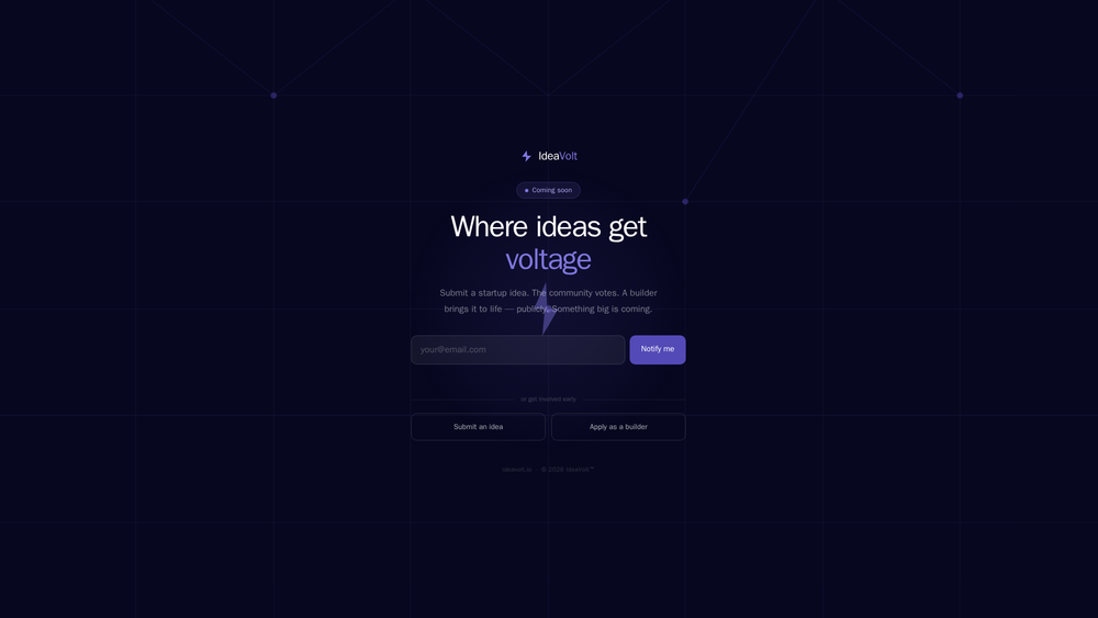 IdeaVolt is a collaborative platform designed to transform startup ideas into reality through community-driven processes. The platform operates on a three-step model: users submit startup ideas, the community votes on the most promising concepts, and selected builders then develop these ideas publicly.