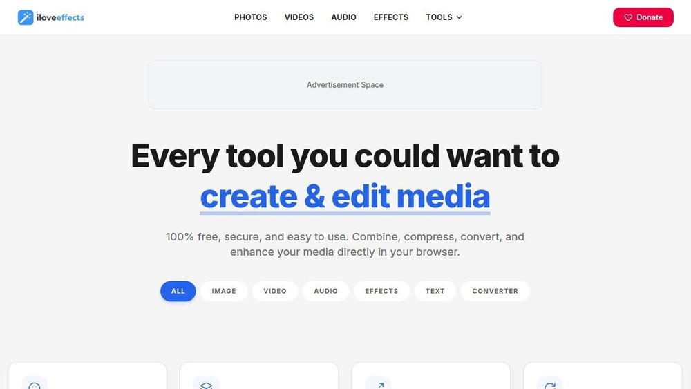 iLoveEffects is a comprehensive web-based toolkit providing over 55 free utilities for various digital tasks. The platform operates entirely in the browser, eliminating the need for software downloads or user registration. Key features include image resizing and compression, GIF to MP4 conversion, meme generation, PDF merging, QR code creation, photo effects application, and various format converters (PNG to ICO, SVG to PNG). Additional utilities include Base64 encoding, JSON formatting, word counting, and password generation. All tools are designed to be accessible without watermarks or usage limits, targeting individuals and professionals needing quick, no-fuss solutions for common digital tasks. The service emphasizes privacy and convenience by processing files locally in the browser where possible.