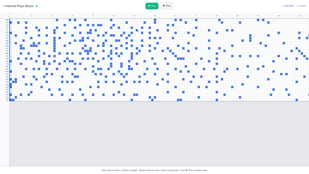 Internet Plays Music is a web-based collaborative music creation platform that enables real-time music composition through a shared step sequencer interface. This tool allows multiple users to simultaneously interact with a musical grid, selecting cells to trigger sounds and create patterns together.