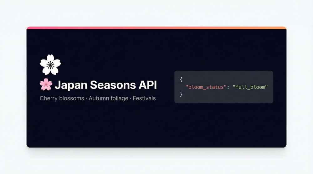Japan Seasons API is a comprehensive REST API service that provides real-time and historical data about Japan's most iconic seasonal phenomena. The API offers three main data categories: