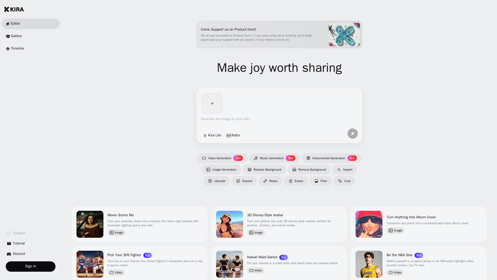 Kira is an AI-powered creative platform that enables users to transform their photos and videos into engaging, shareable content through various AI-driven tools. The platform focuses on making "joy worth sharing" by providing accessible creative transformations for personal and social media use.