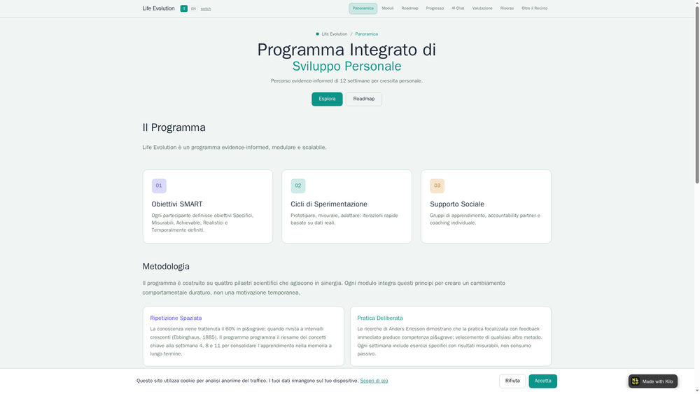 Life Evolution is a comprehensive personal development platform that combines scientific research with practical application through a structured 12-week program. The platform integrates multiple domains of personal growth including cognitive enhancement, emotional resilience, physical health, creativity development, and social impact.