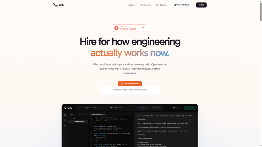 - Shipping-First Approach: Unlike traditional technical interviews, Lintic evaluates candidates based on their actual ability to ship production code