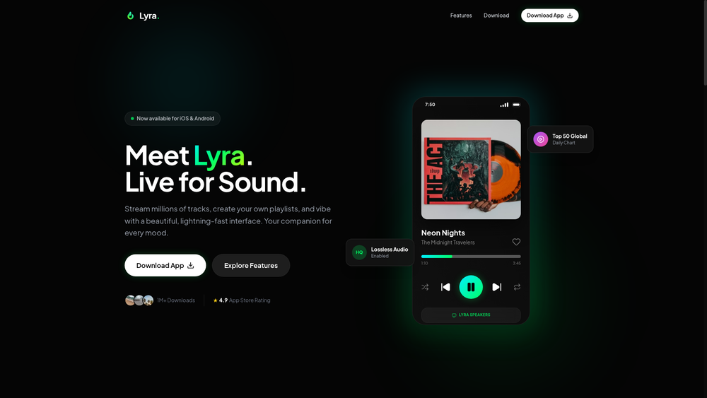 Lyra Music is a contemporary music platform designed with a sleek, dark-themed interface that emphasizes visual appeal and user engagement. The platform utilizes advanced CSS techniques including glassmorphism effects, gradient text treatments, and custom scrollbar styling to create an immersive audio environment.