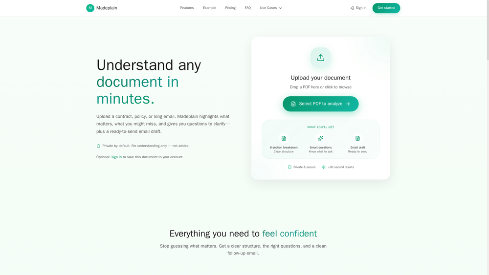 Madeplain is an AI document analysis platform designed to help users understand complex legal, contractual, and policy documents. By uploading PDF documents, users receive structured breakdowns that highlight key terms, hidden risks, and important deadlines.