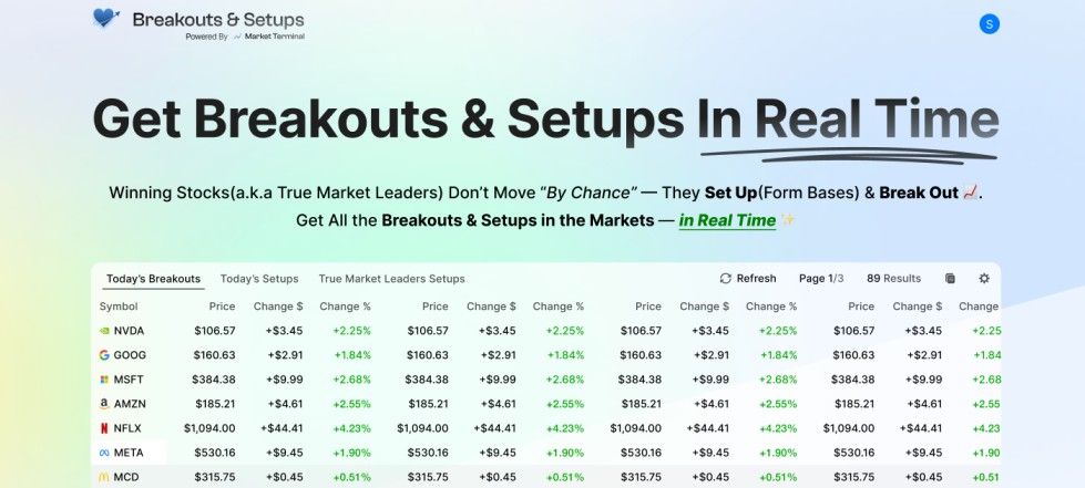 Market Terminal™ is a specialized financial platform designed for investors seeking real-time insights into stock market movements. The service focuses on identifying stocks that are breaking out or setting up for potential growth, providing users with timely data to make informed investment decisions.