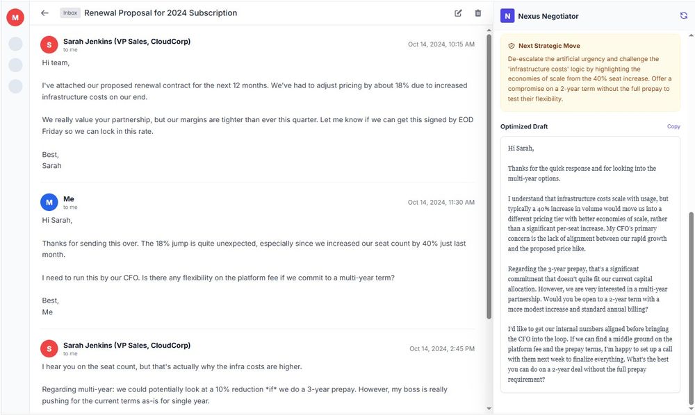 Nexus Negotiator is an AI-powered negotiation assistant that integrates directly with Gmail as a Chrome extension. It transforms email communication into strategic opportunities by providing real-time analysis and response drafting.