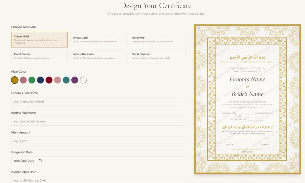 Noor Certificates is a simple online tool for creating professional, customizable nikkah certificates in minutes. Whether you’re planning a mosque ceremony or arranging your nikkah online, our platform lets you generate a beautiful, ready-to-print nikkah template instantly.