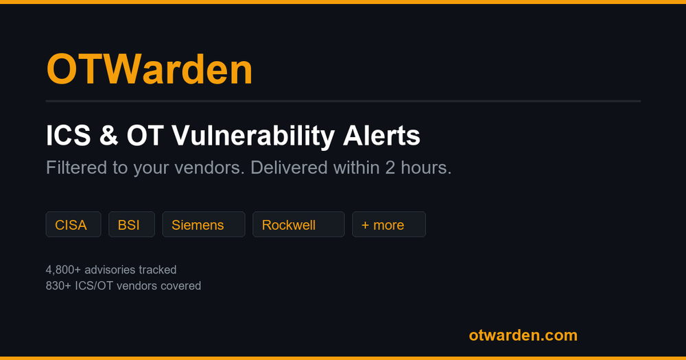 OTWarden is a specialized service that aggregates and filters industrial control system (ICS) vulnerability advisories from authoritative sources like CISA ICS-CERT, BSI CERT-Bund, Siemens ProductCERT, Rockwell Automation, the CISA KEV catalog, and NIST NVD. It eliminates the noise of manually checking multiple security feeds by delivering targeted email alerts only when vulnerabilities affect your specific equipment—such as PLCs, SCADA systems, and controllers—within 2 hours of publication.