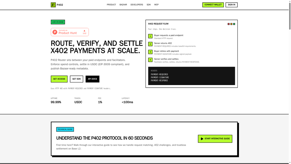 P402 Router is a payment infrastructure solution designed specifically for the x402 protocol, which enables HTTP 402 payment-required responses for API monetization. It sits between paid endpoints and payment facilitators to provide a comprehensive routing and control layer.