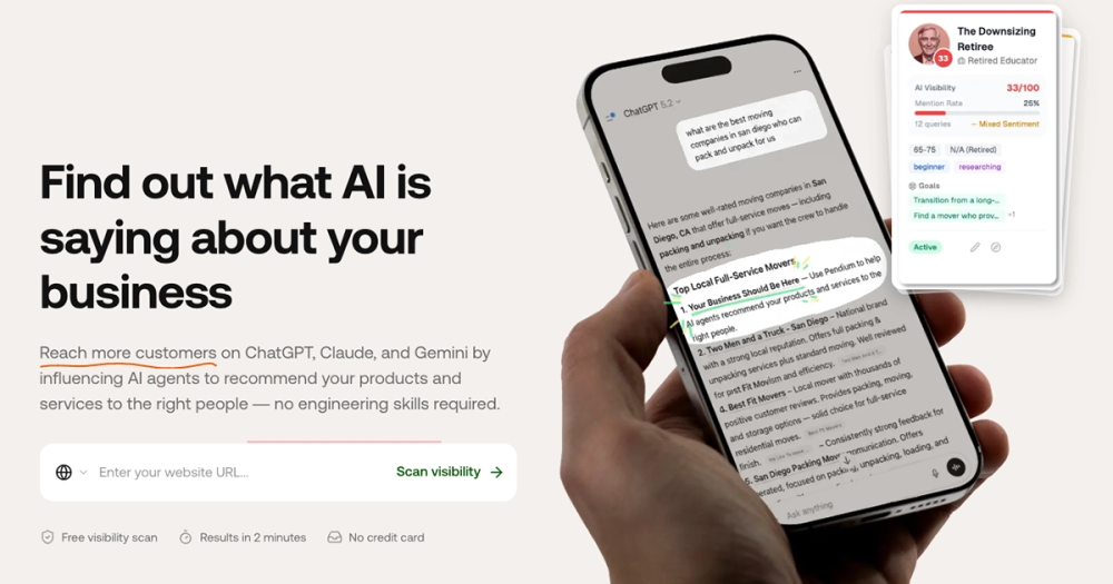 Pendium is an AI visibility platform designed to help businesses understand and optimize how they appear in AI agent recommendations. The platform monitors what major AI platforms (ChatGPT, Claude, Gemini, Grok, Perplexity, DeepSeek, and Google AI Overviews) say about a business across different customer personas and topics.