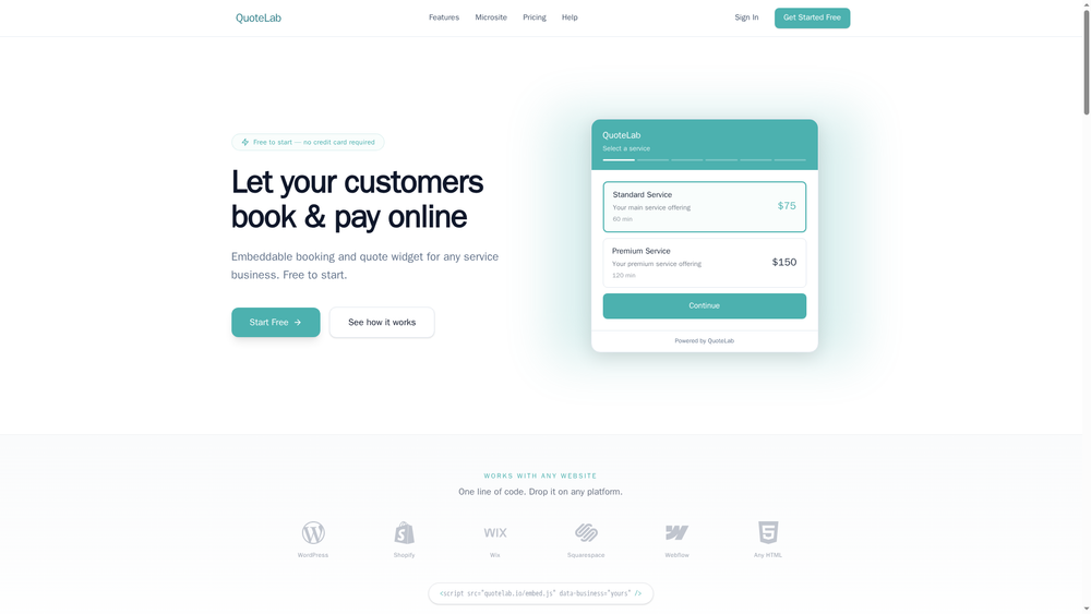 QuoteLab is a comprehensive software solution designed specifically for service businesses to streamline their booking, quoting, and payment processes. It provides an embeddable widget that can be added to any website with just one line of code, enabling customers to book services, receive instant quotes, and make payments online without leaving the business's site.
