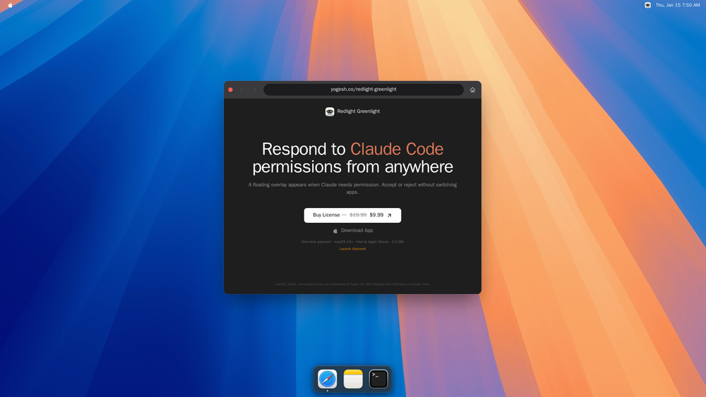 Redlight Greenlight is a native macOS application designed specifically for developers working with Claude Code. It addresses a common workflow interruption by displaying permission requests from Claude Code in a floating overlay that appears directly in your workspace.