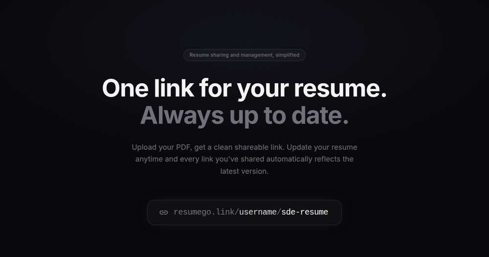 resumeGo is a resume sharing and management platform that simplifies how you share your resume. Upload your PDF (under 3MB) and instantly receive a clean, memorable URL like resumego.link/username/resume-name. Every link you share automatically updates to the latest version when you upload a new file—no re-sending, no broken links. Key features include: