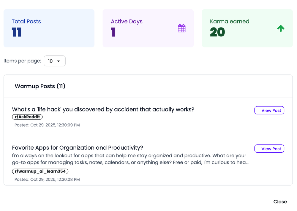 - AI-Powered Account Warmup: Automatically engages with relevant communities using context-aware AI to build karma naturally and establish credibility.
