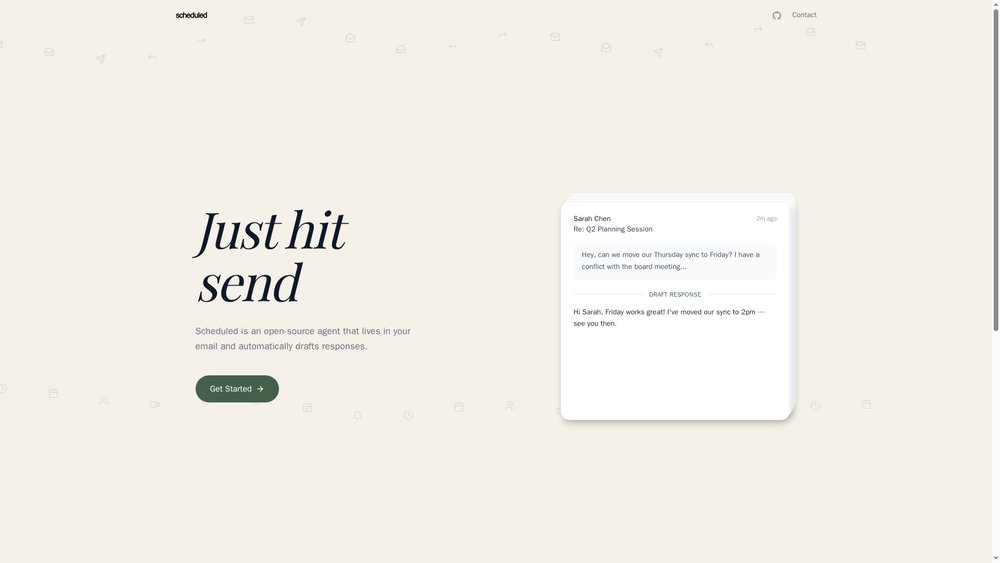 Scheduled is an open-source AI agent that automates email scheduling by reading incoming emails, checking your calendar availability, and drafting contextually appropriate responses. It eliminates the back-and-forth typically involved in scheduling meetings and appointments.