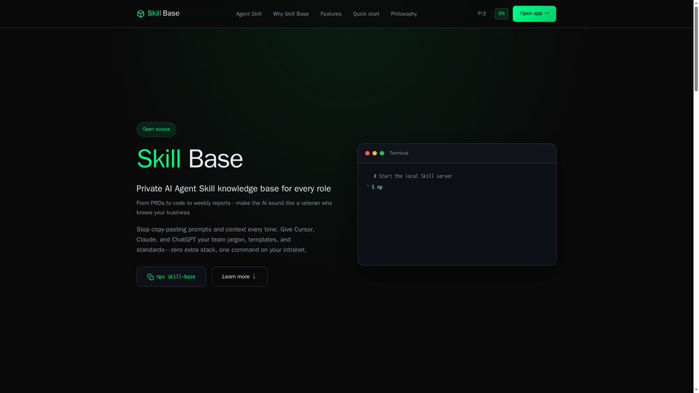 Skill Base is an open-source, self-hosted platform for managing and distributing AI Agent Skills within teams. It solves the problem of repeatedly copying prompts and context by providing a centralized repository for business knowledge, engineering standards, and workflow templates.