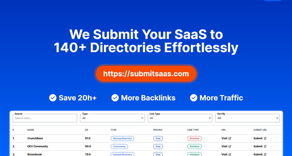 SubmitSaaS is a directory submission service that helps SaaS founders increase their online visibility by submitting their product to over 140 curated directories. The service handles the entire submission process, including creating a dedicated email, building profiles, and providing a detailed report with screenshots. Key features include: