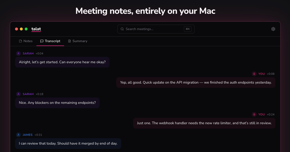 talat is a privacy-focused meeting assistant application for macOS that records, transcribes, and summarizes meetings entirely on your local machine. Using Apple's Neural Engine for transcription and optional local LLMs for summarization, talat ensures that your sensitive meeting data never leaves your computer.