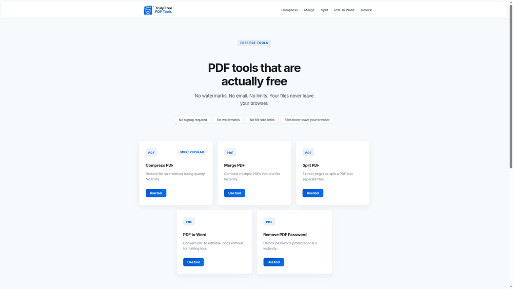 TrulyFree PDF Tools is a collection of free, browser-based PDF utilities that require no signup, impose no file size limits, and add no watermarks. All processing happens locally in the user's browser, ensuring files never leave the device. The suite includes tools for compressing PDFs without quality loss, merging multiple PDFs into one, splitting PDFs into separate files, converting PDFs to editable Word documents, and removing passwords from protected PDFs. Designed as a privacy-focused alternative to services like Smallpdf and ILovePDF, it offers unlimited usage at no cost. The tools are ideal for students, professionals, and anyone needing quick PDF manipulation without compromising data security.