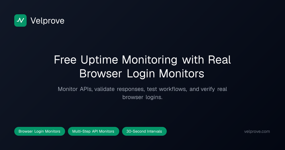 Velprove is a functional monitoring platform that goes beyond traditional uptime checking by verifying real user workflows. Unlike basic ping monitors that only check if servers respond with 200 OK status codes, Velprove tests what actually matters: browser login flows, multi-step API workflows, response data validation, and SSL certificate health.